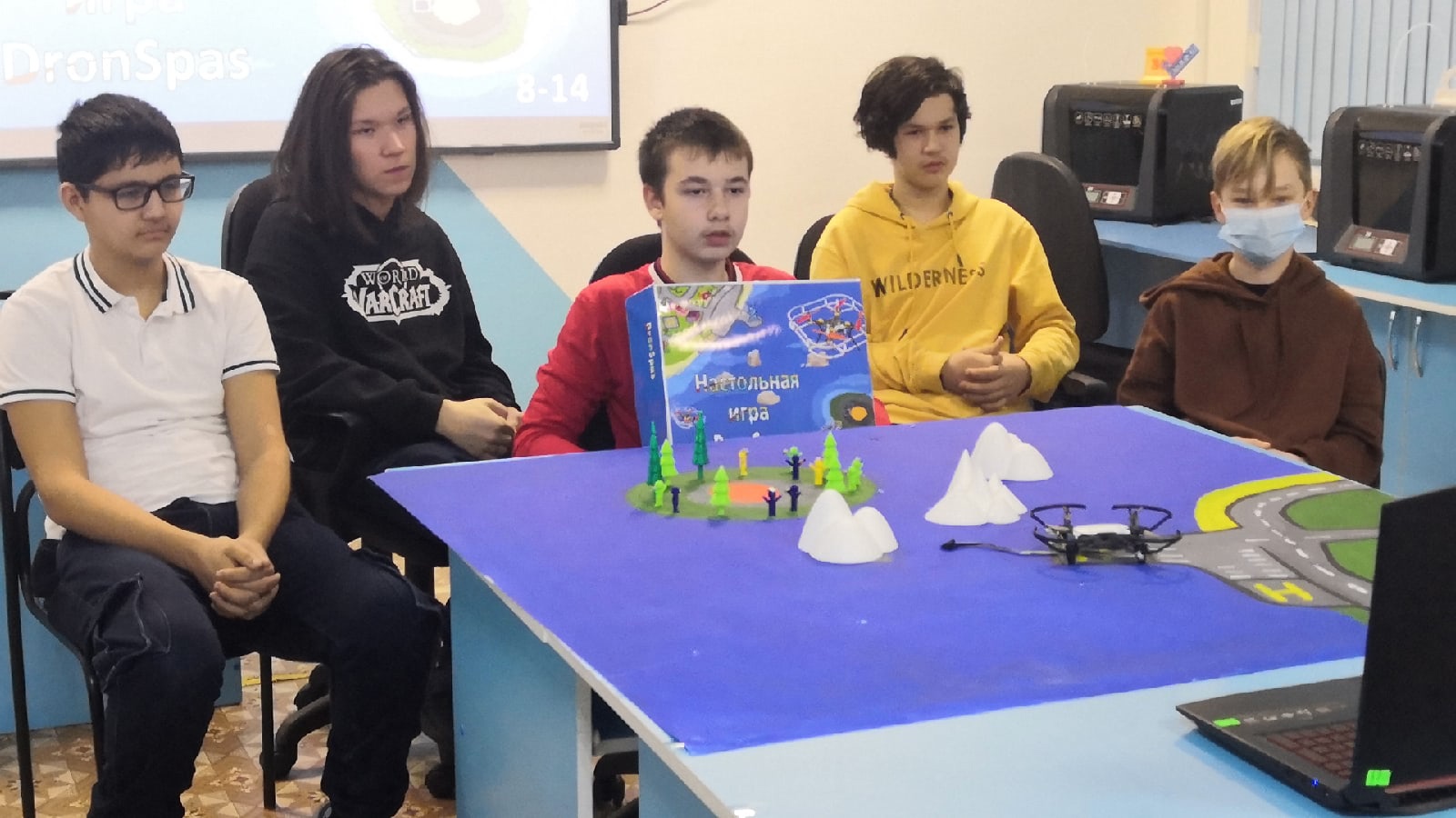 Учащиеся объединения «Айтишники» представили проект настольной игры DronSpas, главная задача которой – спасти с помощью дронов команду учёных на острове, где спустя некоторое время взорвётся вулкан. При этом можно не только управлять беспилотниками, но и собирать их. В игре предусмотрено множество вариантов, которые позволяют разнообразить её процесс.