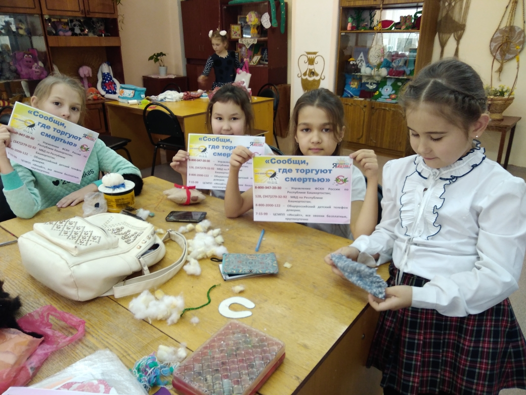 наркомании в подростковой и молодёжной среде.ДД(Ю)Т активно принимает участие в антинаркотической акции «Сообщи, где торгуют смертью». На занятиях прошли мероприятия педагоги рассказывали о вреде наркомании,рассказ сопровождался видео - клипами: «Пока не поздно», «Моя вина», «Наркотикам нет»!, «Профилактика наркотической зависимости». Детям также были сообщены адреса сайтов в интернете для подростков, куда они могут обратиться за нужной информацией в трудную для них минуту. В объединении «Фантазия» в период акции были изготовлены и распространены буклеты с указанием телефона доверия. Акция продолжается.....